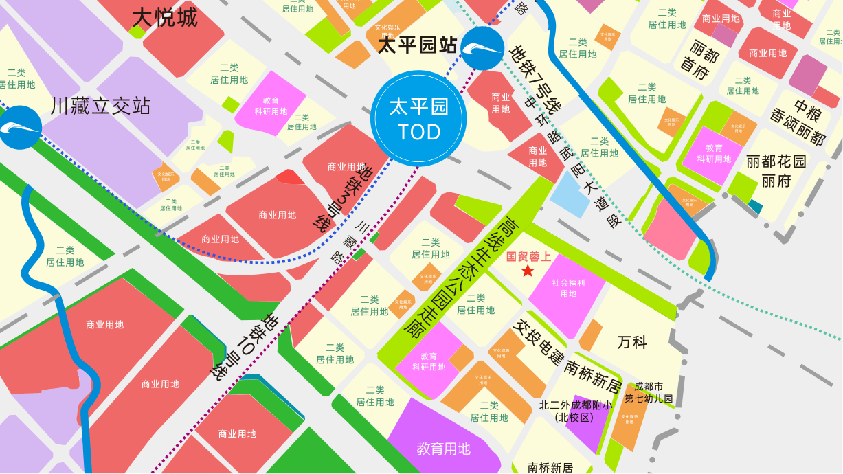 承平园TOD项目设想研究范畴达12平方公里,占地面积约1293亩,全体规划为一芯两轴两廊四片,一芯为承平园TOD焦点,汇聚 3、7、10地铁交汇,贯穿全城的轨道交通枢纽区域,还规划了从城第三座城市候机楼,将来将会成为成都从城的西南门户。