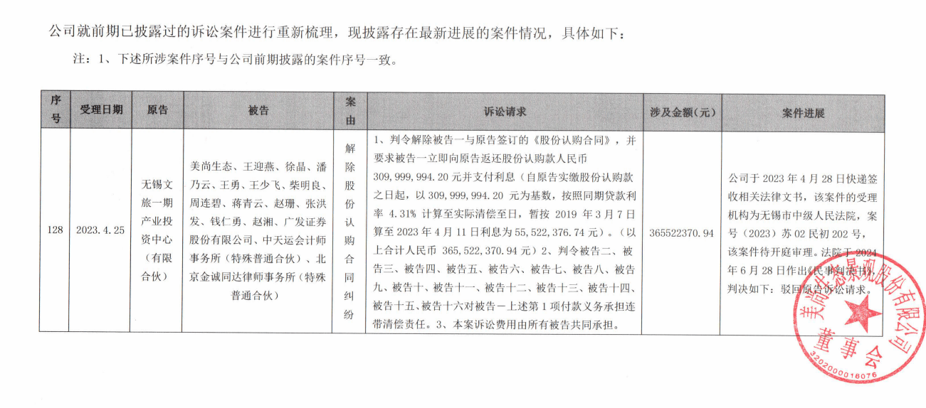 来历:文峰大世界连锁成长股份无限公司关于投资者诉讼事项的进展通知布告(编号:临2025-004)2025年1月10日,公司收到江苏省高级送达的《平易近事》【(2024)苏平易近终1446号】,江苏省高级就刘某某、周某某等4名天然人投资者取徐翔、徐长江、文峰股份证券市场义务胶葛一案做出二审讯决。现将相关环境通知布告如下:公司于2024年9月收到江苏省南京市中级送达的《平易近事》【(2021)苏01平易近初2281号】,江苏省南京市中级就被告刘某某、周某某等4名天然人投资者取徐翔、徐长江、文峰股份证券市场义务胶葛一案做出一审讯决:(1)要求被告徐翔、徐长江补偿合计丧失1,102,627。55元;(2)文峰股份对上述补偿权利承担连带义务,并正在现实承担义务后,有权向被告徐翔、徐长江逃偿;(3)驳回此中两名被告的其他诉讼请求。具体内容详见公司于2024年9月5日披露的《关于投资者诉讼事项的通知布告》(临2024-054)。公司对于一审讯决不服,向江苏省高级提起上诉,请求:(1)依法撤销一审讯决第二项判决内容(即“文峰股份对徐翔、徐长江补偿权利承担连带义务,并正在现实承担义务后,有权向被告徐翔、徐长江逃偿”),并改判驳回刘某某、周某某等4名天然人投资者要求文峰股份承担补偿义务的诉讼请求;(2)本案一、二审诉讼费用由刘某某、周某某等4名天然人投资者承担。公司次要上诉来由:(1)文峰股份客不雅上不存正在的居心、客不雅上未实施行为,原审讯决错误认定配合侵权,从而判决文峰股份就投资者丧失承担连带补偿义务,该认定现实不清且合用法令错误。(2)原审讯决正在关系认定及投资者丧失计较等方面亦存正在错误,忽略了投资者本身要素及证券市场系统性风险所形成的影响,不妥扩大了补偿义务范畴,其委托第三方出具的《证券投资者丧失测算征询看法书》不该做为裁判根据。(3)本案判决成果影响庞大,二审法院正在裁判时充实留意对文峰股份现有投资者好处的,并依法“平易近事补偿优先”准绳。具体内容详见公司于2024年11月2日披露的《关于投资者诉讼事项的进展通知布告》(临2024-061)。针对公司上诉请求,江苏省高级认为文峰股份为徐翔、徐长江证券买卖市场行为供给帮帮,应连带承担证券买卖市场平易近事补偿义务。至于文峰股份被徐翔、徐长江节制发布响应通知布告等,正在三者之间能否发生响应法令后果问题,取本案投资者从意徐翔、徐长江、文峰股份承担侵权补偿义务无关,不属于本案审理范畴,故原审法院判决文峰股份取徐翔、徐长江承担连带义务准确,但正在本案中认定徐翔、徐长江行为损害文峰股份的权益、文峰股份向投资者现实承担义务后有权向徐翔、徐长江逃偿不妥,本院予以改正。江苏省高级按照《中华人平易近国证券法》(2014年批改)第五条、第七十七条,《中华人平易近国侵权义务法》第九条第一款,《最高关于合用<中华人平易近国平易近>时间效力的若干》第一条第二款,《中华人平易近国平易近事诉讼法》第一百七十七条第一款第(二)项之,判决如下:1、维持一审讯决第一项、第三项和案件诉讼费用承担内容;2、变动一审讯决第二项“文峰股份对徐翔、徐长江上述第一项补偿权利承担连带补偿义务,并正在现实承担义务后,有权向徐翔、徐长江逃偿”为“文峰股份对徐翔、徐长江上述第一项补偿权利承担连带补偿义务”。该当按照《中华人平易近国平易近事诉讼法》第二百六十四条,加倍领取迟延履行期间的债权利钱。本判决为终审讯决。为现有全体股东好处,公司正正在取专业律师团队就该案件规画申请再审或事宜。公司将关心诉讼后续进展环境并及时履行消息披露权利,敬请泛博投资者投资,留意投资风险。上海西信消息科技股份无限公司严沉诉讼进展通知布告(通知布告编号:2025-001,从办券商:申万宏源承销保荐)西信消息近日自动查询到上海市浦东新区新立案消息,案号为:(2025)沪0115平易近初5840号。本案件拟于2025年2月20日9时40分正在张江第一法庭(A1楼)开庭。诉讼请求:依法判令被告西信消息偿还被告贷款本金人平易近币3,824,063。36元;截至2024年9月20日的利钱535。19元、过期利钱135,809元以及自2024年9月21日起至现实了债之日止的过期利钱,领取被告为实现债务而领取的律师费22。800元;被告袁亚对被告西信消息上述债权正在最高额10,000,000元范畴内承担连带了债义务。依法判令本案的案件受理费、财富保全费、通知布告费等由二被告配合承担。公司于2024年10月14日正在全国股份让渡系统官网披露了本诉讼案件,通知布告编号2024-054。因被告变动了告状对象和诉讼请求,需从头对外披露该诉讼案件最新进展环境。来历:浙江东望时代科技股份无限公司关于公司涉及诉讼的进展通知布告(通知布告编号:临2025-002)2018年6月,浙江东望时代科技股份无限公司(东望时代)取甘肃银行股份无限公司签定《最高额质押合同》,合同商定上市公司以其持有的浙商银行6,491。40万股A股股票就广厦控股集团无限公司(以下简称“广厦控股”)取甘肃银行签订的《单据认购和谈》供给不跨越2亿元的最高额质押。2019年6月,广厦控股偿还其正在甘肃银行相关债权,并于同月刊行新的债券。2020年11月,广厦控股通过借新还旧体例全数偿还于2019年6月发布的新债券。因而,上市公司认为已无需承担质押义务。但甘肃银行一曲未共同公司打点股权的