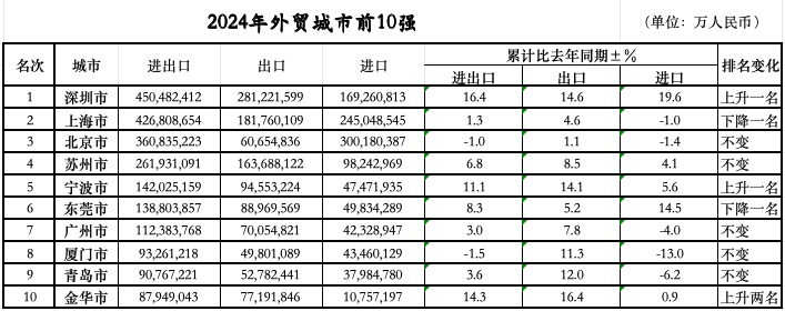 第一财经梳理海关总署的数据,2024年全国外贸前10强城市别离为:深圳、上海、姑苏、宁波、东莞、金华、广州、、杭州和青岛。比宁波更猛的是正在2023年排名第二的深圳,凭仗16。4%的增速跃升至2024年的全国外贸“冠军”。除了时隔9年后沉返内地外贸城市首位,深圳本身也实现了更多冲破2024年4。5万亿元的进出口规模为初次冲破4万亿,16。4%的同比增速别离较全国、广东省快11。4个、6。6个百分点。进口、出口也均为汗青新高,此中,出口2。81万亿元,增加14。6%,实现32连冠;进口1。69万亿元,增加19。6%。2024年全年8838万份报关单中的最初一张,记实的恰是深圳一家平易近营企业的出口消息。这张报关单为2024年中国外贸进出口画上了一个句号。也恰是正在这一年,深圳平易近营企业的外贸规模占比初次冲破7成。2024年,深圳平易近营企业有进出话柄绩企业数量近4。7万家,企业数量占比近9成,合计进出口3。16万亿元,增加24。2%,快于深圳市全体7。8个百分点,占同期总值的70。1%,成为拉动深圳外贸增加的次要动力。宁波的平易近营企业数量占比更是跨越了9成,外贸规模则接近8成。数据显示,2024年,宁波的平易近营企业数量已添加至近2。7万家,占同期宁波市外贸企业总数的90。9%,此中,外贸规模超亿元平易近营企业数量添加至1690家。同期,宁波平易近营企业进出口1。09万亿元,增加13%,占全市进出口总值的76。6%。进出口总值从第六名升至第五名之外,宁波的出口规模正在全国城市中排名第四,仅次于深圳、上海和姑苏。另一座正在2024年较着上升的城市是坐拥“世界小商品之都”义乌的金华。从2023年的第12位跻身全国前10强的跃升,也让金华初次超越杭州,位居浙江省第二。浙江金华海关的动静称,2024年金华外贸规模再立异高,共实现外贸进出口总值8794。9亿元,同比增加14。3%,增速居浙江省首位。出口做为其强项,客岁金华出口达7719。2亿元,同比增加16。4%,占浙江省的份额为19。8%,创下汗青新高。金华的进出口近8成由义乌贡献,而义乌的平易近营经济占领了90%以上的市场从体、实现了90%以上的P。2024年前11个月,浙江省义乌市进出口总值就冲破了6000亿元,同比增加17。6%。此中出口5420。6亿元,同比增加17。4%;进口719。3亿元,同比增加19。0%,进出口、出口和进口值占全省份额别离为12。8%、15。2%和5。8%,占比别离提拔1。2、1。1和0。9个百分点。面临全球订单的碎片化趋向,市场采购模式对本地甚至周边的出口具有较着的拉动感化。2024年前11个月,同比增加21。7%,占义乌市出口总值的80。3%,拉动义乌市出口增加16。8个百分点。另据浙江中国小商品城集团股份无限公司数据,2024年,义乌中国小商品市场日均人流22。43万人次,此中日均外商超3900人,创10年新高。除了正在外贸前10强中实现了跃升的城市案例,从全国层面看,平易近营企业的贡献也正在持续提高。2024年,我国平易近营企业进出口24。33万亿元,增加8。8%,占全国外贸总值的比沉提拔至55。5%,继续成为外贸第一大运营从体。的数据还显示,2024年的平易近企进出话柄现了三个“初次”,别离是有进出话柄绩的平易近营企业数量初次跨越60万家,达到60。9万家;平易近营企业初次成为我国高手艺产物的最猛进出口从体;平易近营企业占我国消费品进口比沉初次跨越50%,同比提拔2。8个百分点至51。3%,此中正在日化用品。