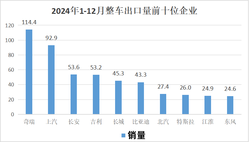 2024年,整车出口前十企业中,从增速上来看,比亚迪出口43。3万辆,同比增加71。8%;长安出口53。6万辆,同比增加49。6%;江淮出口24。9万辆。