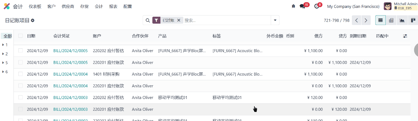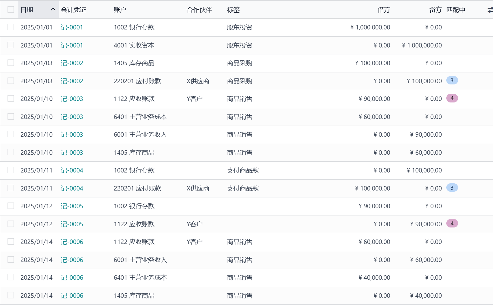 即记账的凭证号,截图是凭证明细行,即会计分录。此中前两行形成会计凭证BILL/2024/12/0005即会计科目,示例截图的凭证BILL/2024/12/0005是采购对应的记账凭证。采购入库时候借记 库存商品,贷记 对付暂估。因此收到采购时候,借记 对付暂估,贷记 对付账款。往来账,也即应收对付类会计记账时候,对应的客户、供应商。一般的会计软件中,没有这个字段。为了区分分歧供应商的对付账款,或者区分分歧客户的应收账款,一种常见做法是,为每个供应商和客户设立一个对应的会计科目,如前面示例中的“对付账款-张凡”。正在OdooERP中,间接正在会计分录上添加合做伙伴字段,不需要通细致分会计科目来处理这个问题。该笔分录涉及的产物,正在存货核算,也即入库出库相关的会计凭证中,若是采用“永续盘存制”,会计分录上能够记实入库出库的产物及数量。Odoo中的会计分录,还有产物数量字段,示例截图中没有显示出来。应收对付账款,对应的到期日期。例如,签定的付款条目为60账期,系统会按照日期,加60天,从动计较此到期日期。往来账龄报表即基于此到期日期计较。应收对付类会计分录,若是实收实付了,系统从动核销应收对付,此字段记实核销号码。有核销号码的,暗示该应收对付已核销了,或者部门核销了。