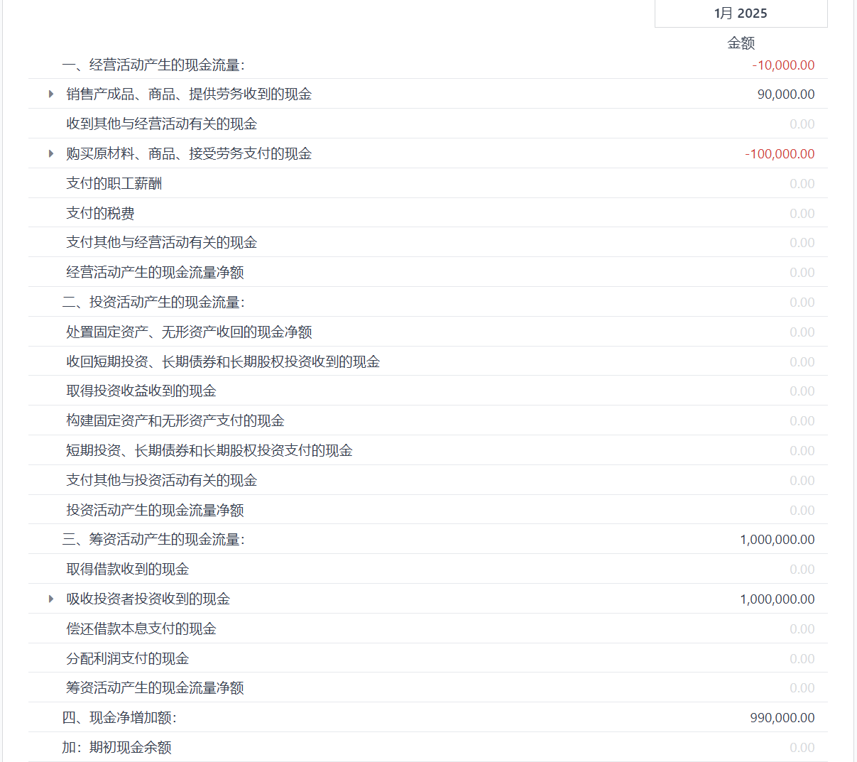 从表中晓得,发生一个月的营业后,公司总资产105万,此中银行存款99万,应收账款6万。此中投资款100万,未分派利润5万。再来看一下现金流量表。如下面截图,1月份发卖收款9万,采购付款10万,运营勾当发生的现金流量-1万。收到投资款100万,期末现金余额99万。