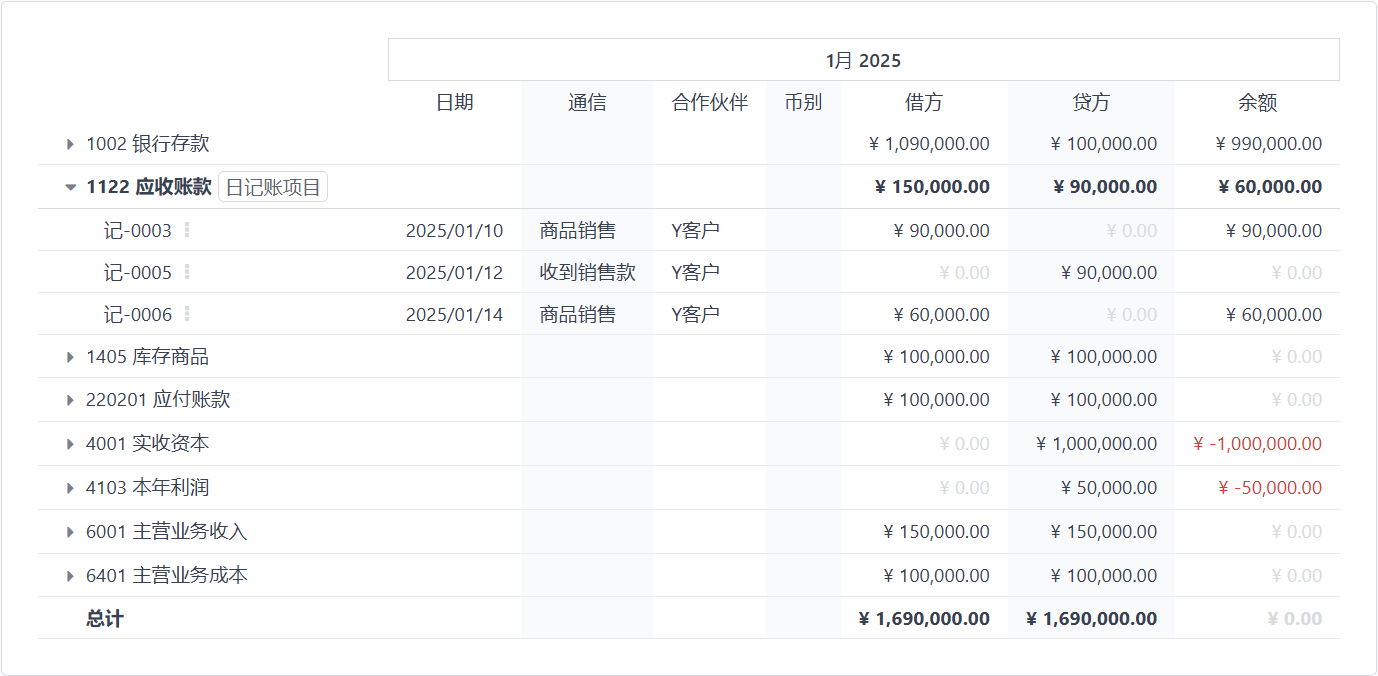 总分类账列出期间各个科目标发生额及余额,点击能够展开科目标明细账。从上表晓得,月末银行存款余额99万,应收账款6万,对付账款都结清了,库存商品也没有了。