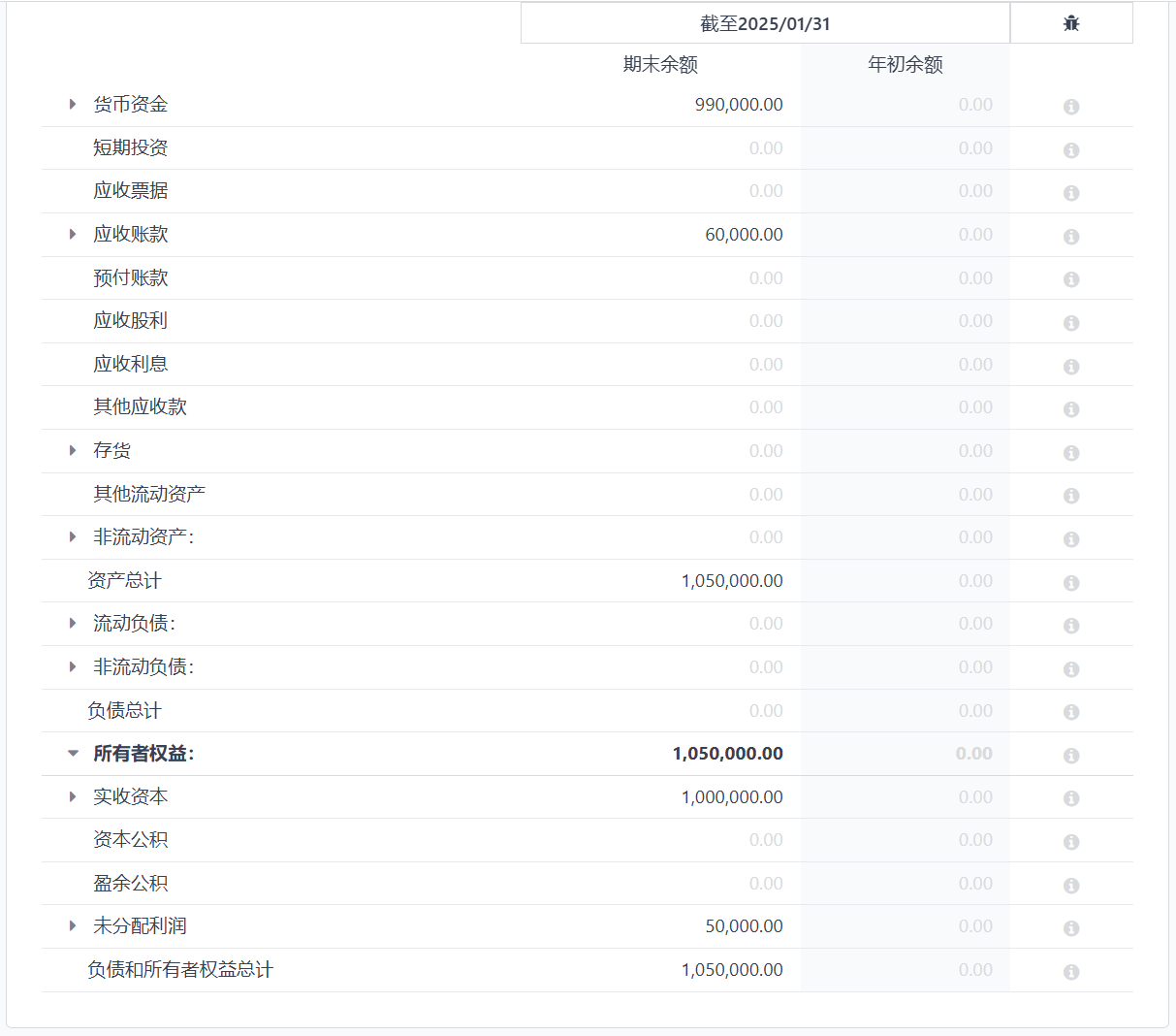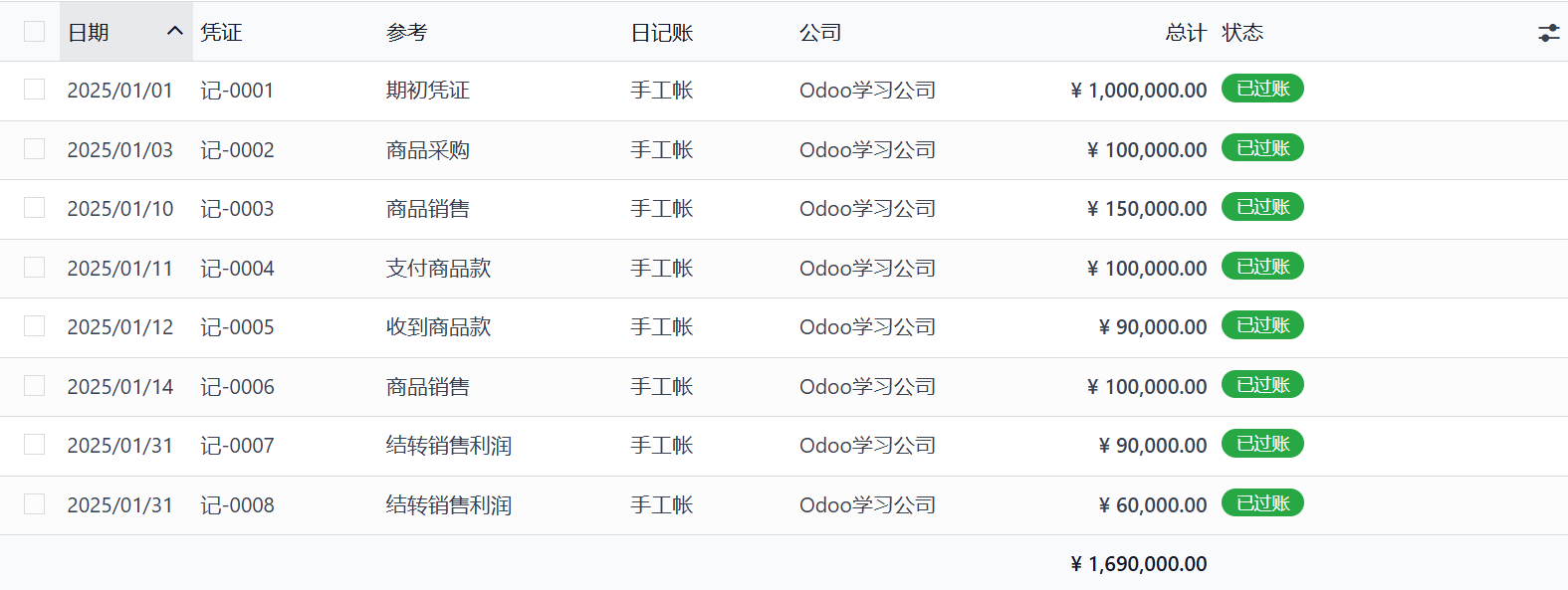 前述营业发生正在几个月内,截图中为了数据演示便利,都集中录入正在2025年1月份。一共八笔会计凭证,此中第一笔“期初凭证”,录入系统上线期初,各个会计科目标余额。