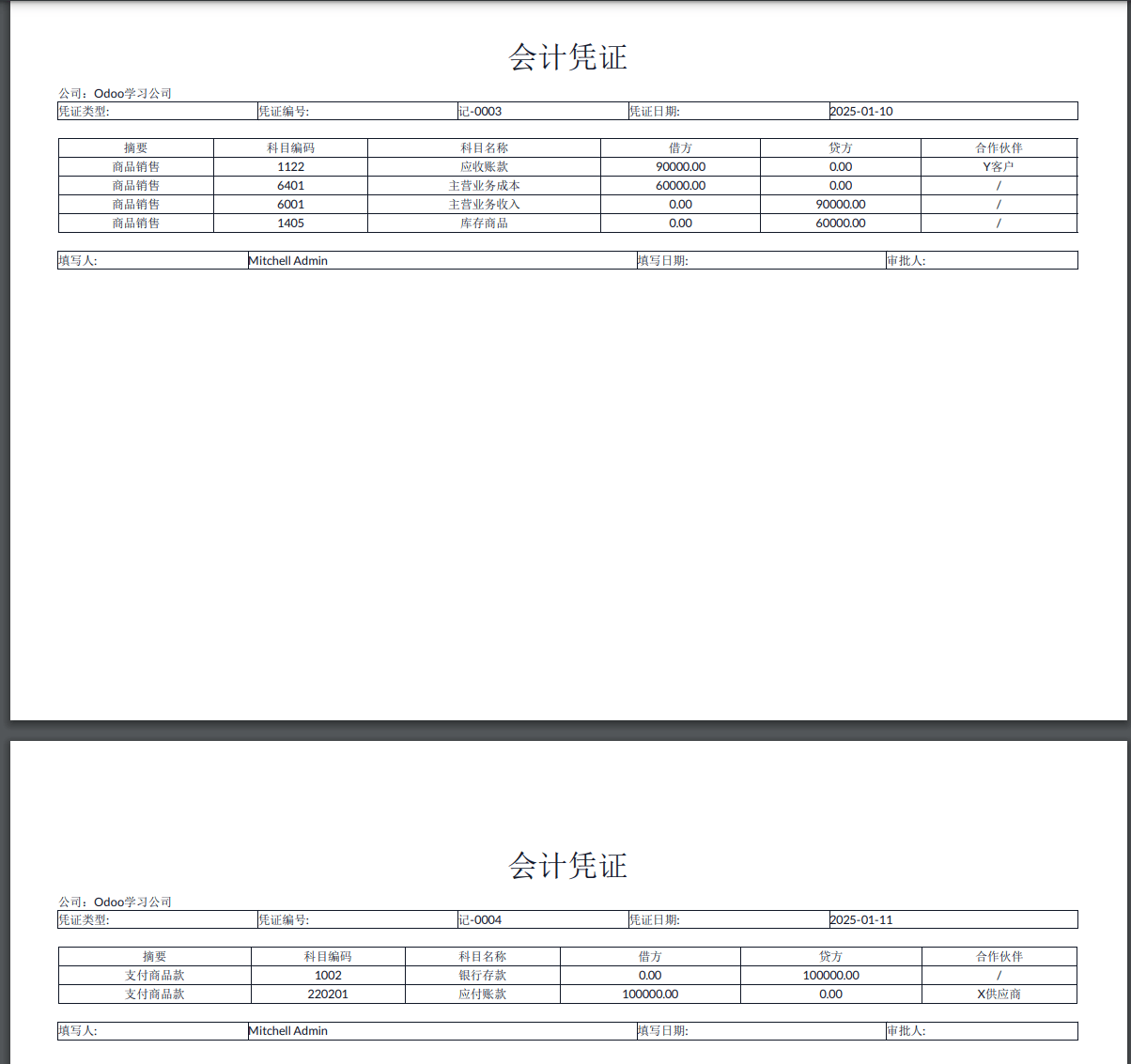 Odoo是全球排名第一的免费开源ERP系统,以其强大的功能和模块化设想著称,合用于各类规模及类型的企业。Odoo集成了出产、采购、发卖、库存、财政、人力资本、市场营销、电子商务等多个模块,供给一坐式办理企业的营业流程,是超越SAP、Oracle、金蝶、鼎捷等一众友商的完满平替首选产物。本节以一个虚拟公司的运做示例,快速总览一下Odoo ERP中若何处置会计凭证、会计报表、会计凭证打印存档。1。 最后,老板投资100万现金设立公司。此时公司银行账上有100万现金,同时老板有100万的股东权益。现金是资产,此时公司的资产欠债表上,现金100万,权益100万,欠债为0。2。 尔后,老板采购了10万元商品,放正在仓库里。和供应商协商了账期60天,因而还没有现实付钱。此时,公司仓库多了10万元库存,同时欠供应商10万元欠债。库存是资产,此时公司的资产欠债表上,资产有100万现金,10万元库存;权益有100万,欠债有10万。资产 = 欠债 + 权益3。 一个月后,10万元商品卖出去了6万,卖了9万,相当于赔了3万。和客户协商的是账期30天,因而也没有现实收到钱。此时,仓库库存还剩下4万元,同时多了9万元的债务。债务属于资产,此时公司资产有100万现金 + 4万元库存 + 9万元债务 = 113万;公司欠债不变,仍是10万,由于赔了3万元,股东权益多了3万,有103万。因而资产113万 = 欠债10万 + 权益103万。4。 又一个月后,领取了供应商欠款10万,收到了客户欠款9万,同时残剩的库存4万都卖掉了,卖了6万,还到钱。此时,公司银行存款有100万 - 10万 + 9万 = 99万,公司库存没有了,债务有6万,因而资产总额105万;公司欠债没有了,股东权益添加了2万,变成了105万。资产105万 = 权益105万。从会计记账的角度,资产老是等于欠债加权益,资产添加了,欠债或者权益也必然添加,反之,资产削减了,欠债或权益也必然削减。这是复式记账,或者说假贷记账法的根基道理。一个月后,卖出去6万元,收入9万元,利润3万元。借记 应收账款9万、从停业务成本 6万,贷记 从停业务收入 9万、库存商品 6万。月底结转利润3万,转入本年利润科目,借记 从停业务收入9万,贷记 从停业务成本6万、本年利润3万。又一个月后,领取供应商欠款,借记 对付账款 10万,贷记 银行存款 10万;收到客户欠款,借记 银行存款 9万,贷记 应收账款 9万。发卖4万库存,借记 应收账款 6万、从停业务成本 4万,贷记 从停业务收入 6万、库存商品 4万。公司会计记账叫会计凭证,或者记账凭证。一笔会计凭证,必有借方科目,贷方科目,借方金额,贷方金额,申明记账事由的摘要,以及记账日期。公司现实利用的记账凭证的样子,如下图示例。这个示例的会计记账,暗示公司向张凡赊购了二十五万元四角七分的水泥砖。