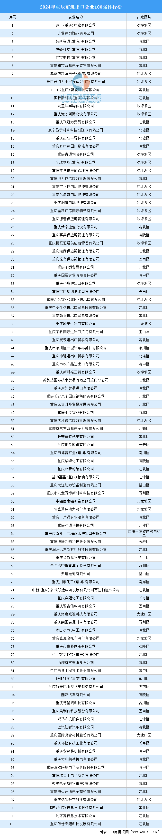 进出口企业100强企业中,渝北区、沙坪坝区各上榜企业100家企业,江北区16家企业上榜,渝中区、巴南区各5家企业上榜。